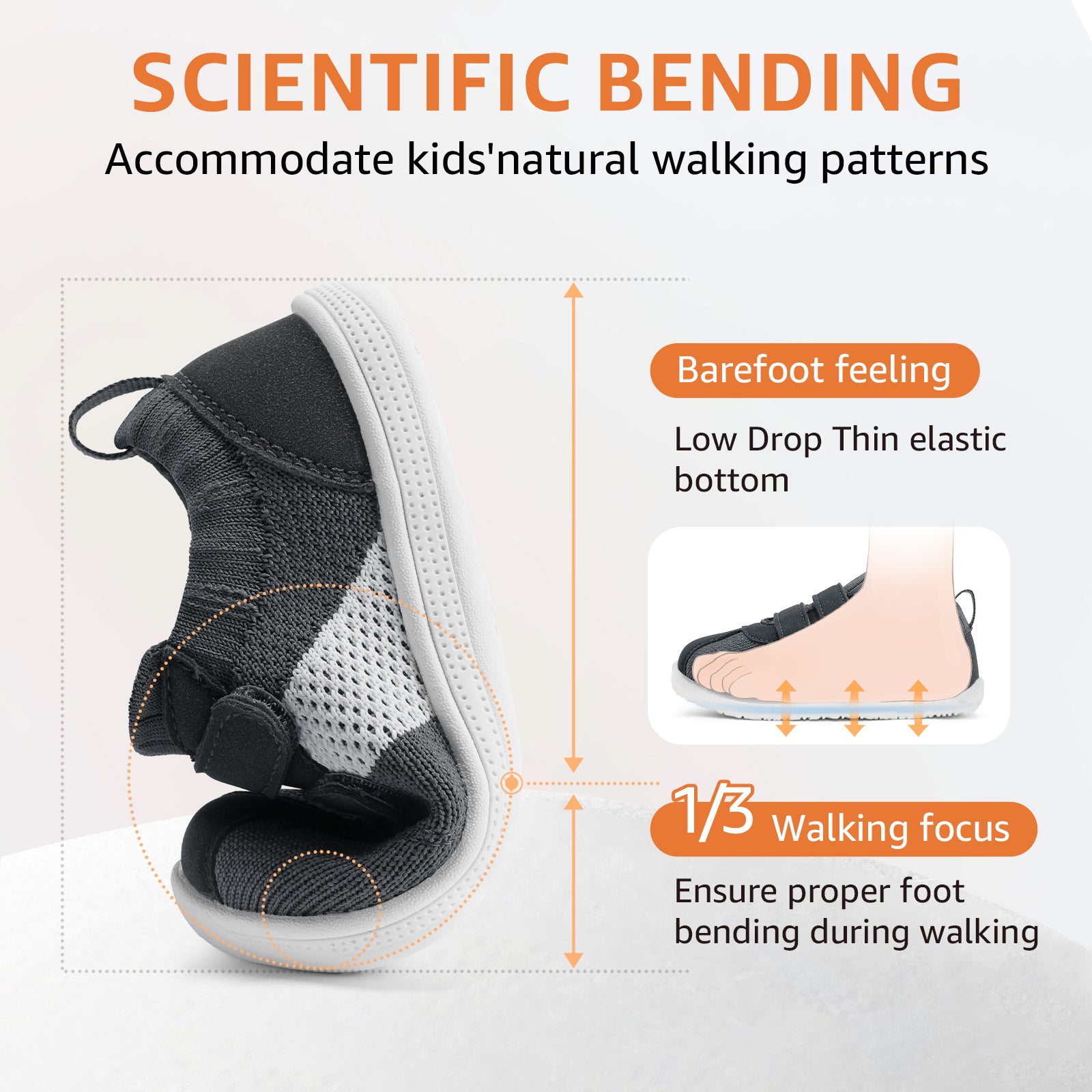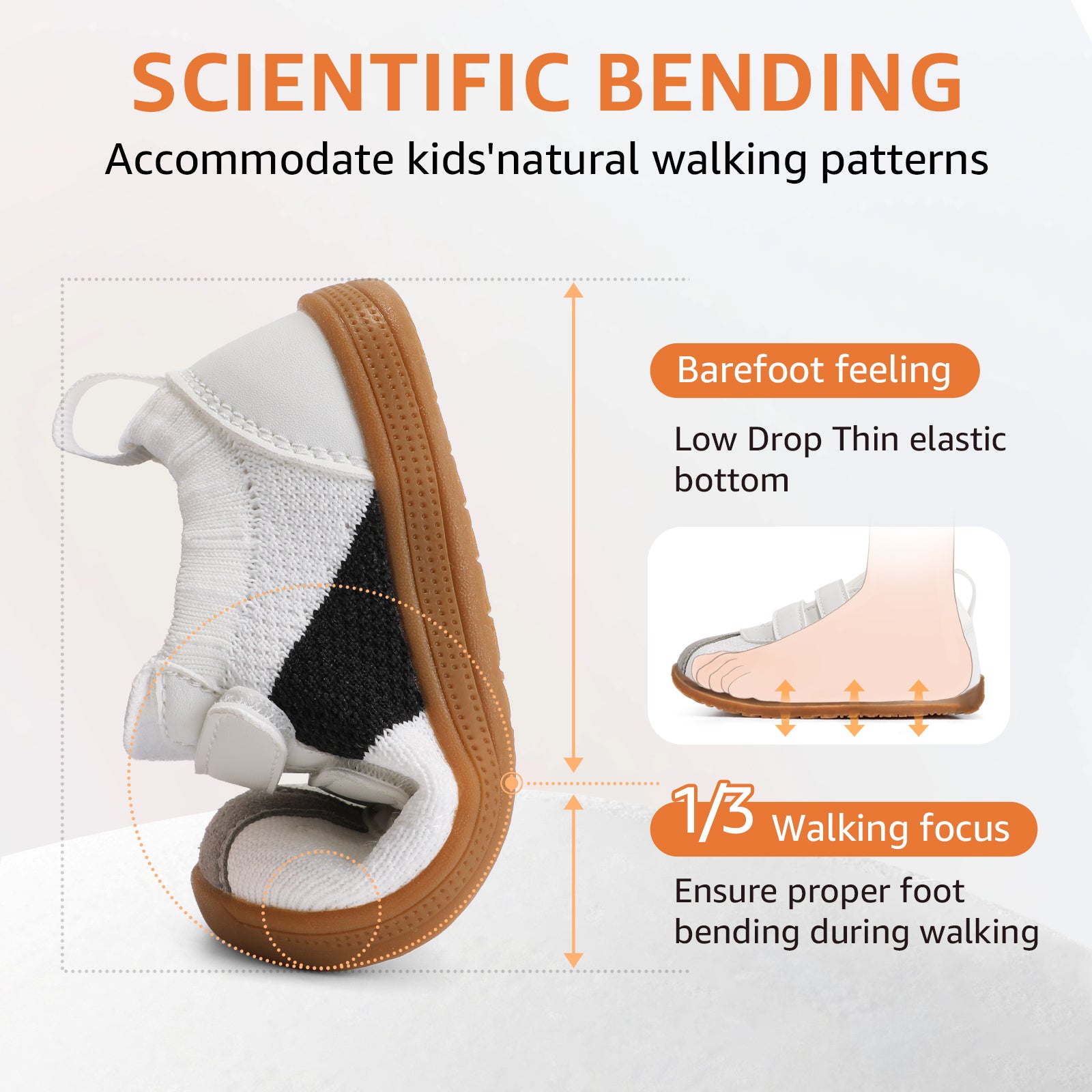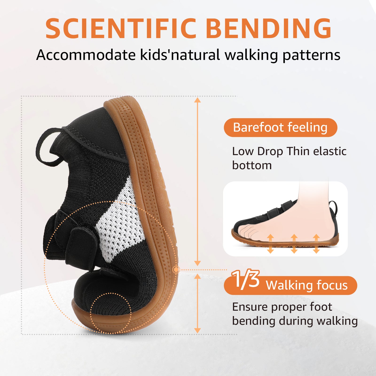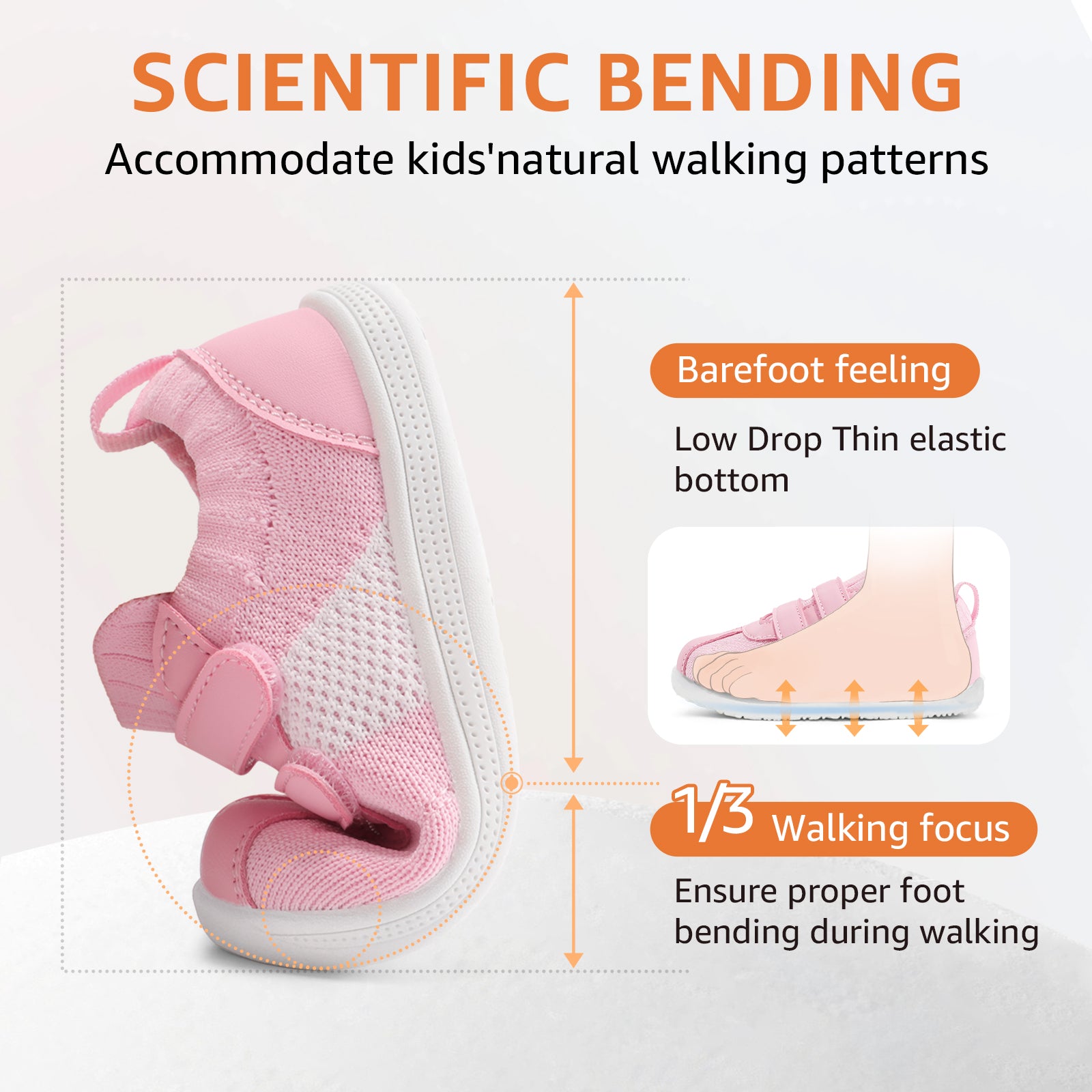 - [ Barefoot Zero Drop ]: Baby first walking shoes feature a flexible sole that bends at the 1/3 point to simulate barefoot walking, letting kids feel the ground. This natural flexibility enhances balance, coordination, and healthy foot development
