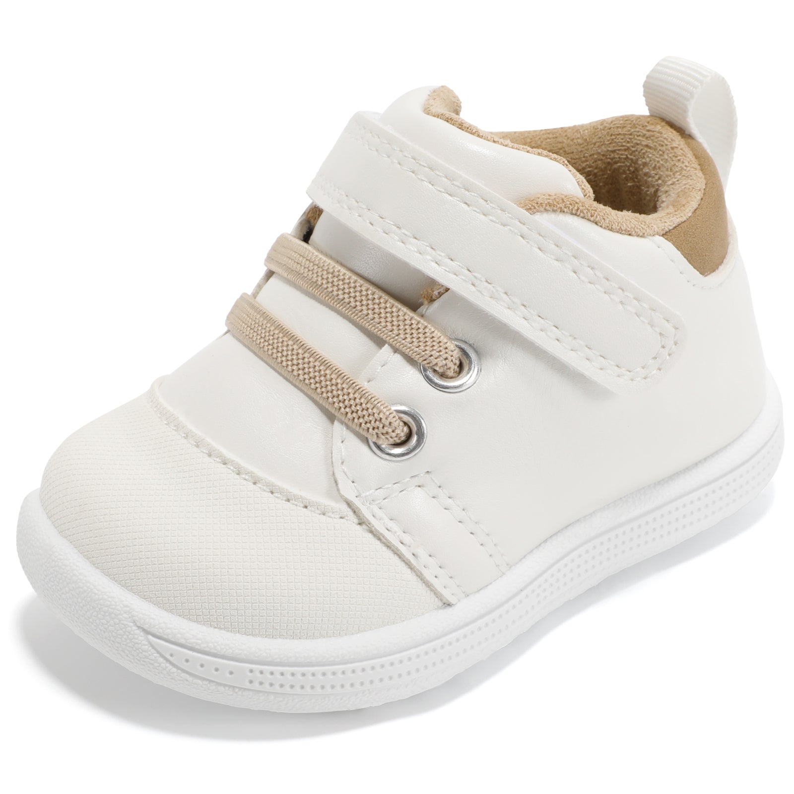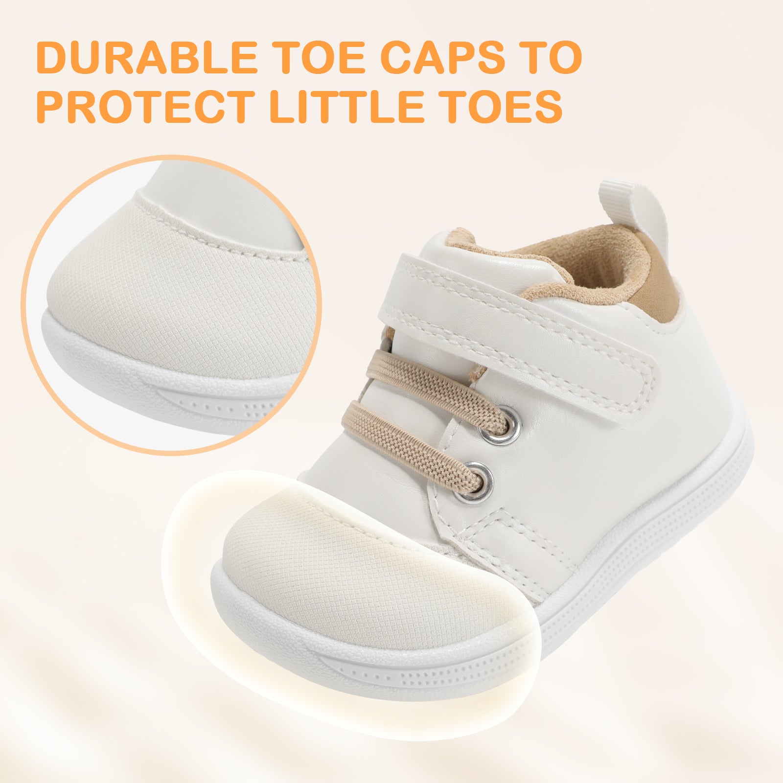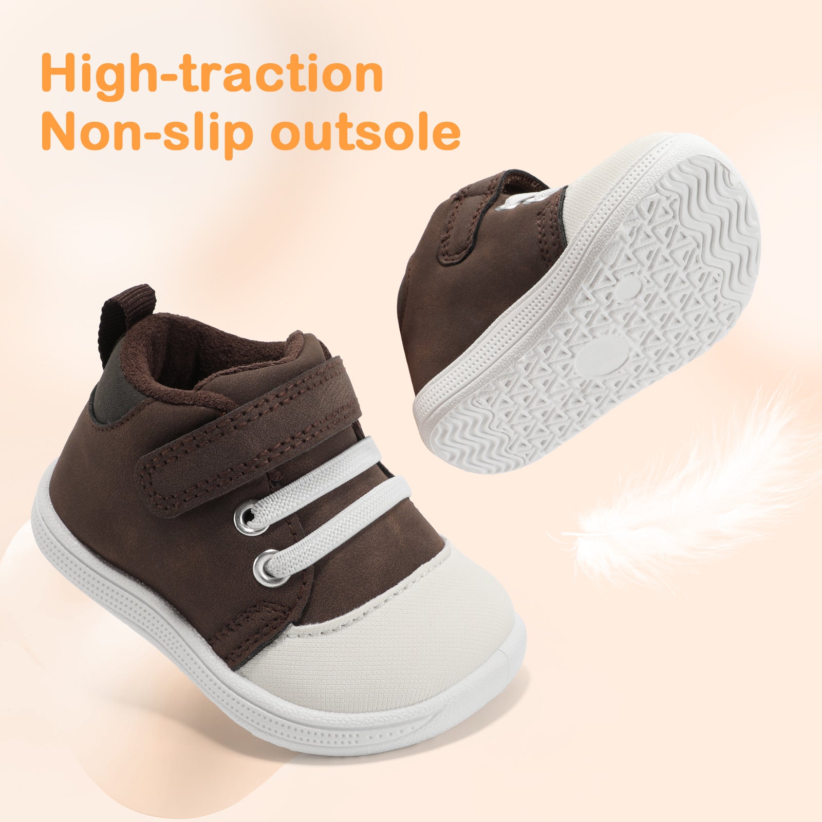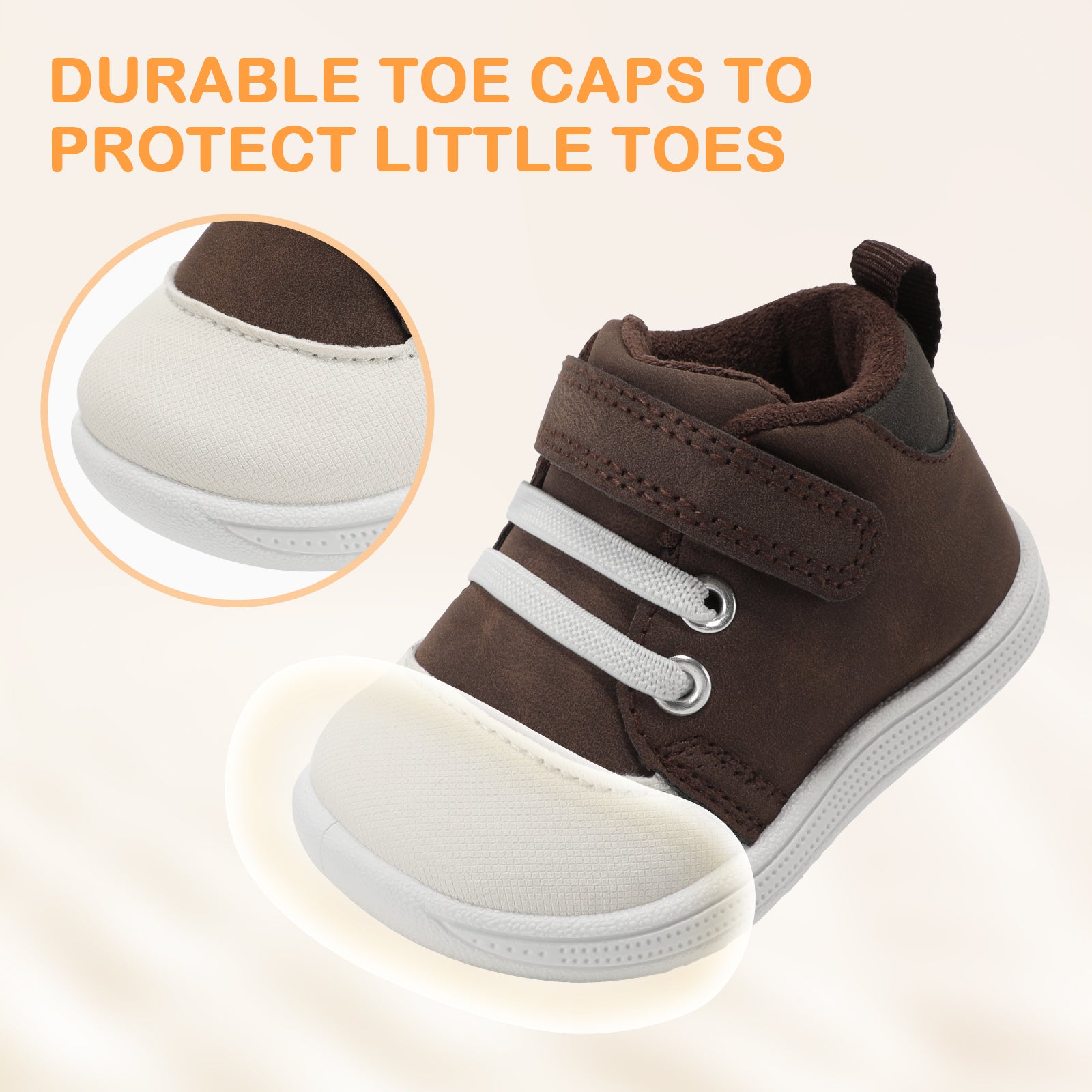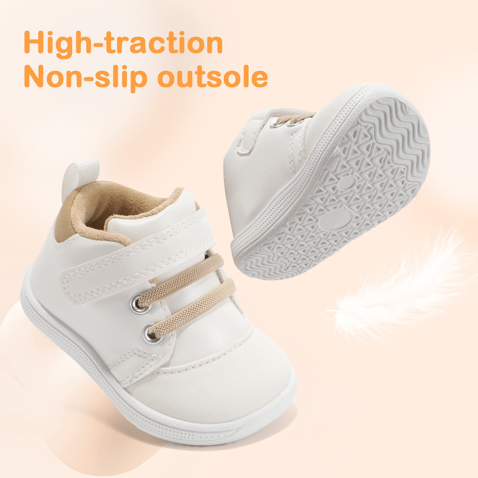 Unisex-Baby Mid-Top First Walker Shoes Wide Toe Box Toddler Boy Girl Barefoot Shoe Soft PU Leather Infant Sneakers with Hook-and-Loop