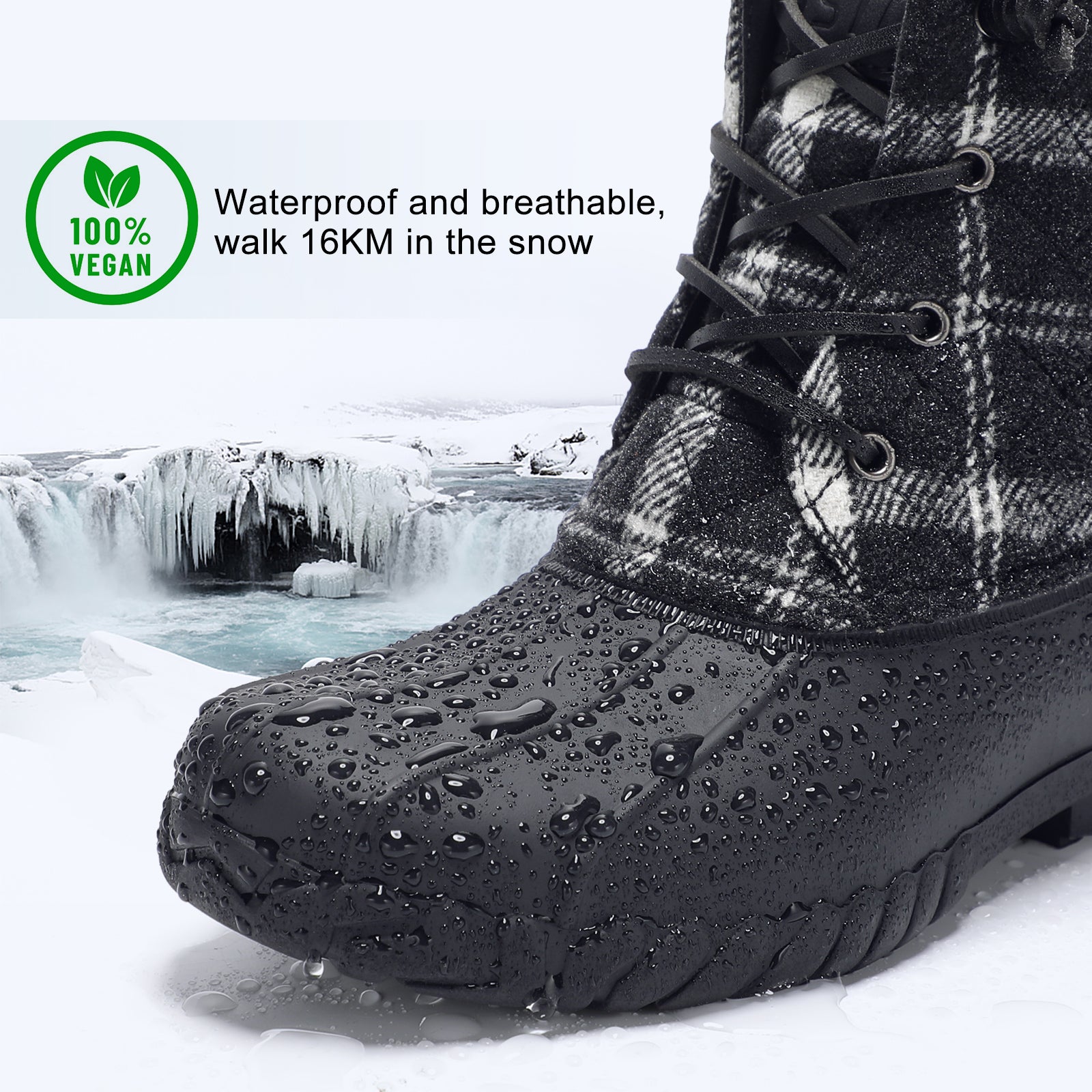 - [ Waterproof Duck Shell ] Duck inspired boot with a rubber shell ensures durable wear and waterproofing for a comfortable and drier foot environment. Long-distance Walking Test: After the researcher walked 16Km in the snow, her feet stayed dry and fresh