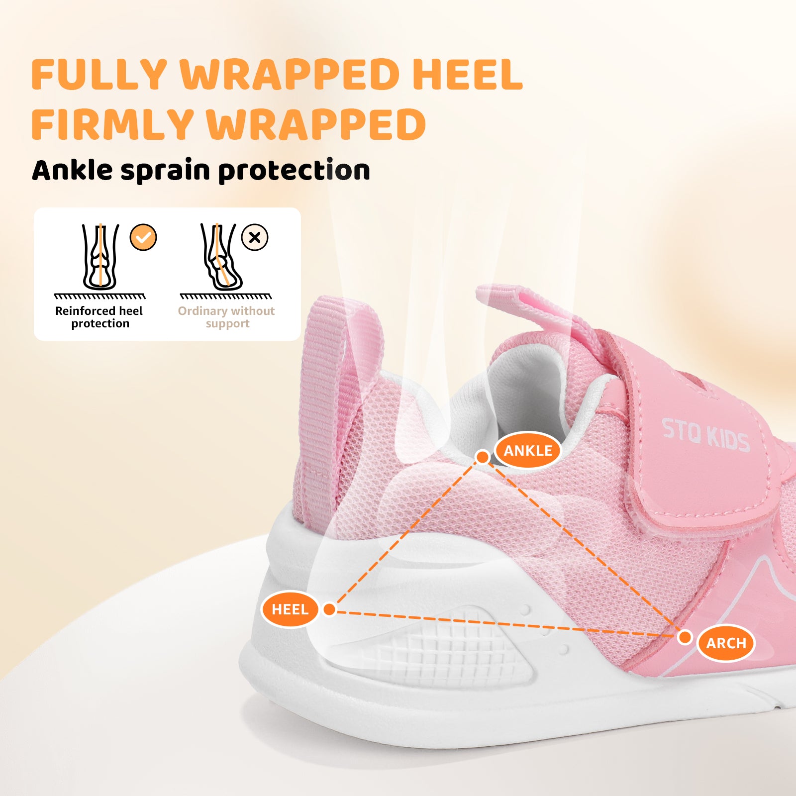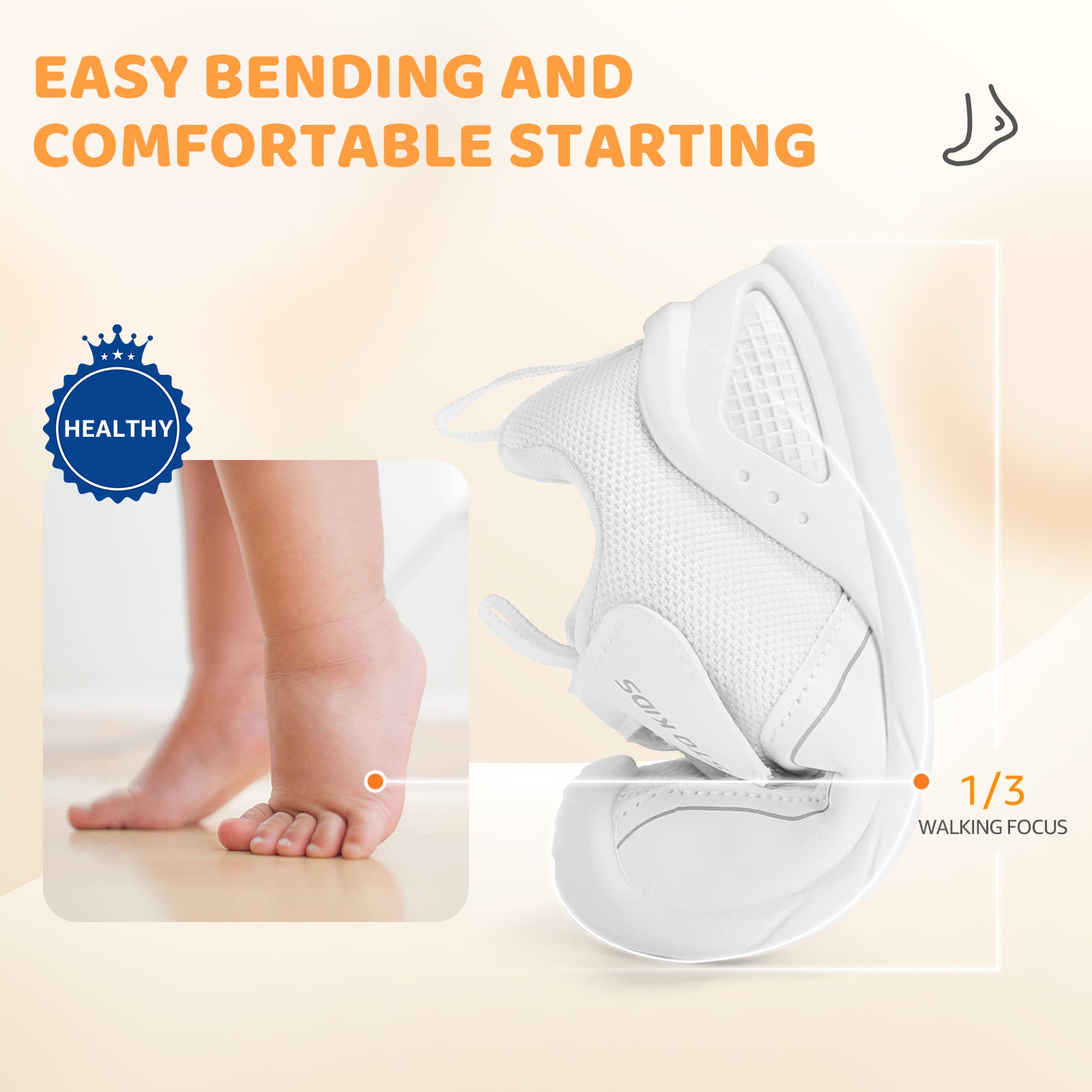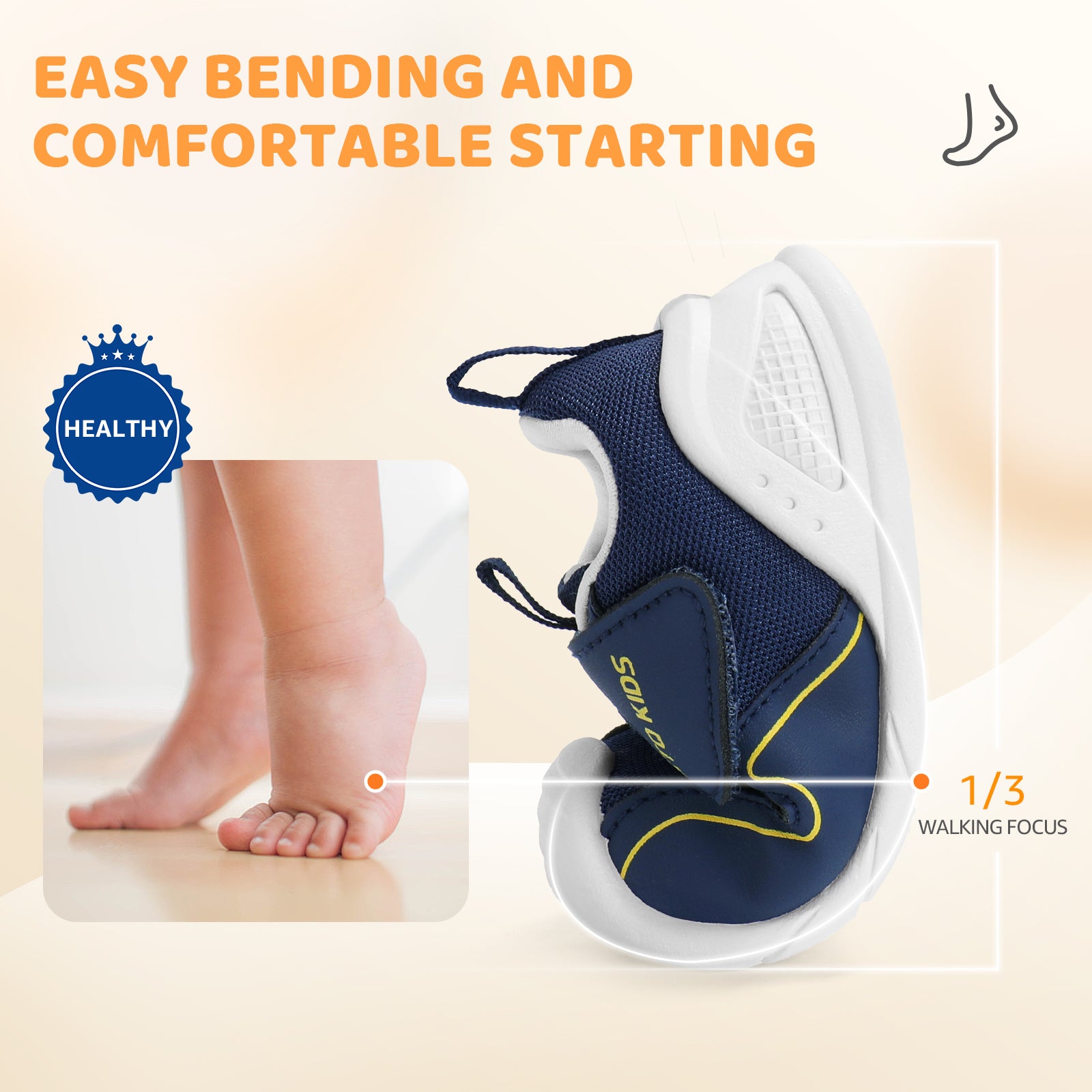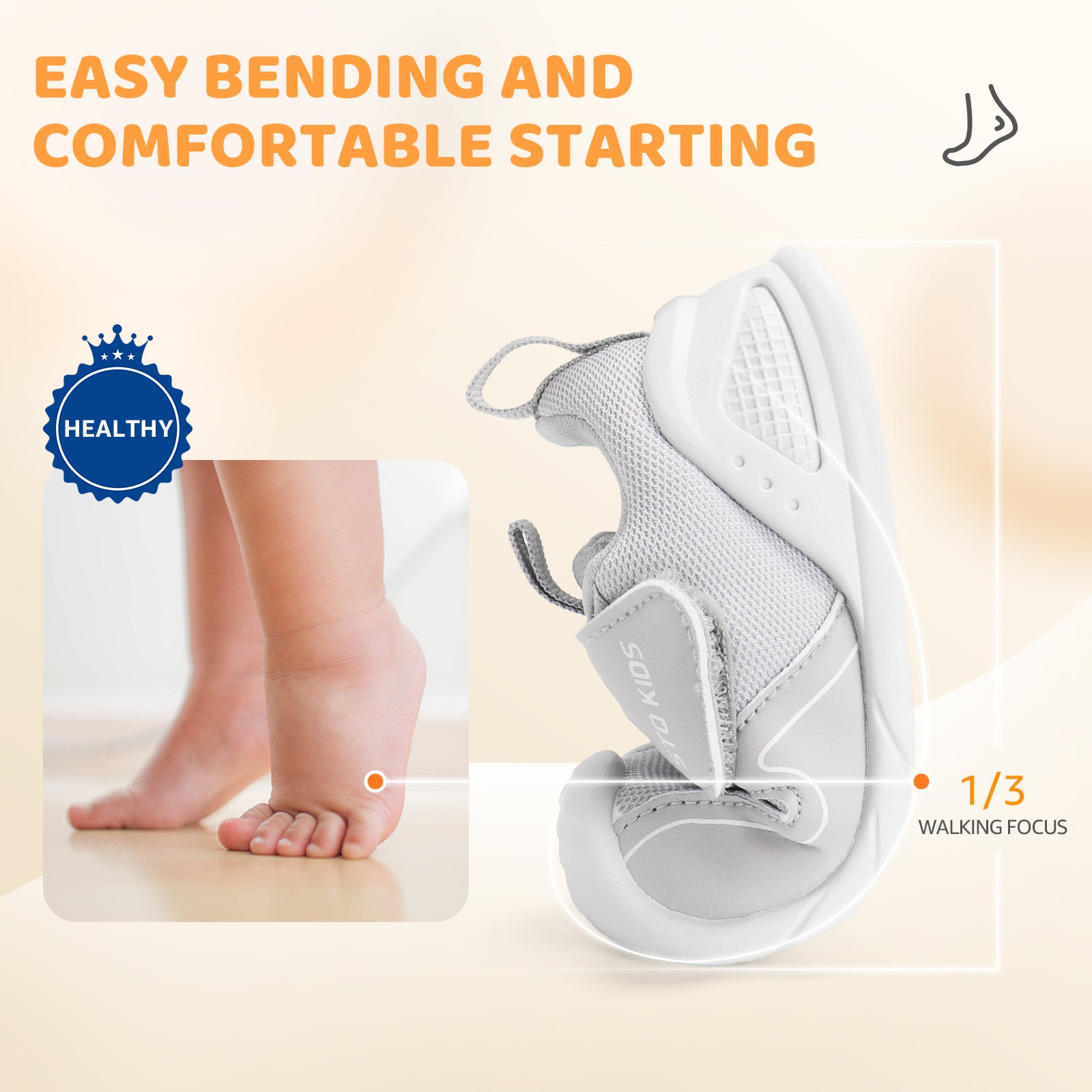 - Moderate support: This baby shoe provides balanced heel support to promote foot muscle development and healthy gait. For babies with poor bone and ligament development, this support can correct heel dislocation, prevent problems such as rearfoot eversion, and enhance gait stability. It can reduce foot pressure, improve balance, and support healthy foot development. Paired with an ultra-soft and flexible TPR sole, it delivers superior comfort while maintaining natural foot movement