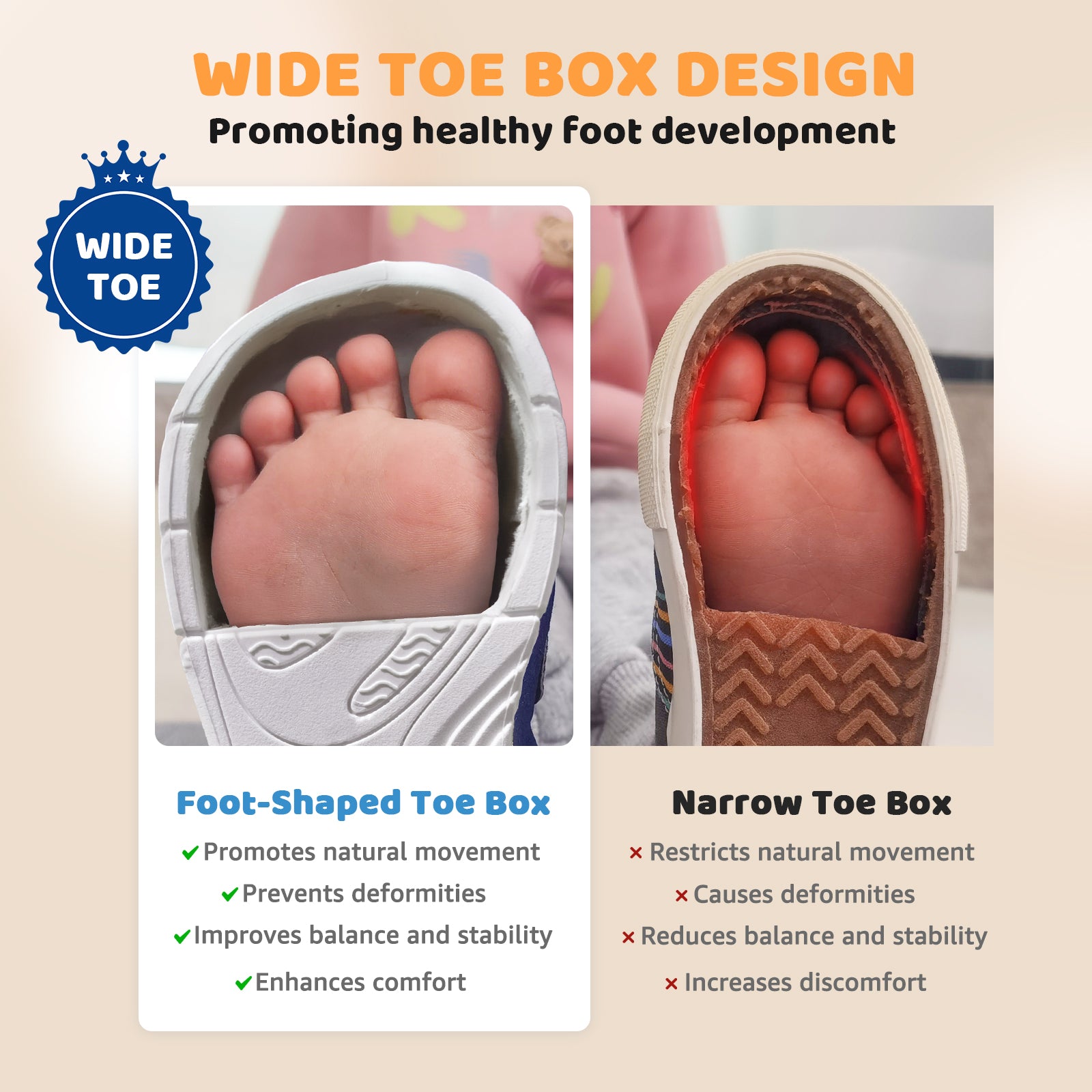 - Wide toe box and zero-drop barefoot design: The wide head design of this baby shoe provides ample space for small toes to move, relieves the discomfort caused by foot pressure, and promotes healthy foot development. The zero-drop sole design simulates barefoot walking, allowing babies to feel the ground, enhance balance and coordination, and support foot development