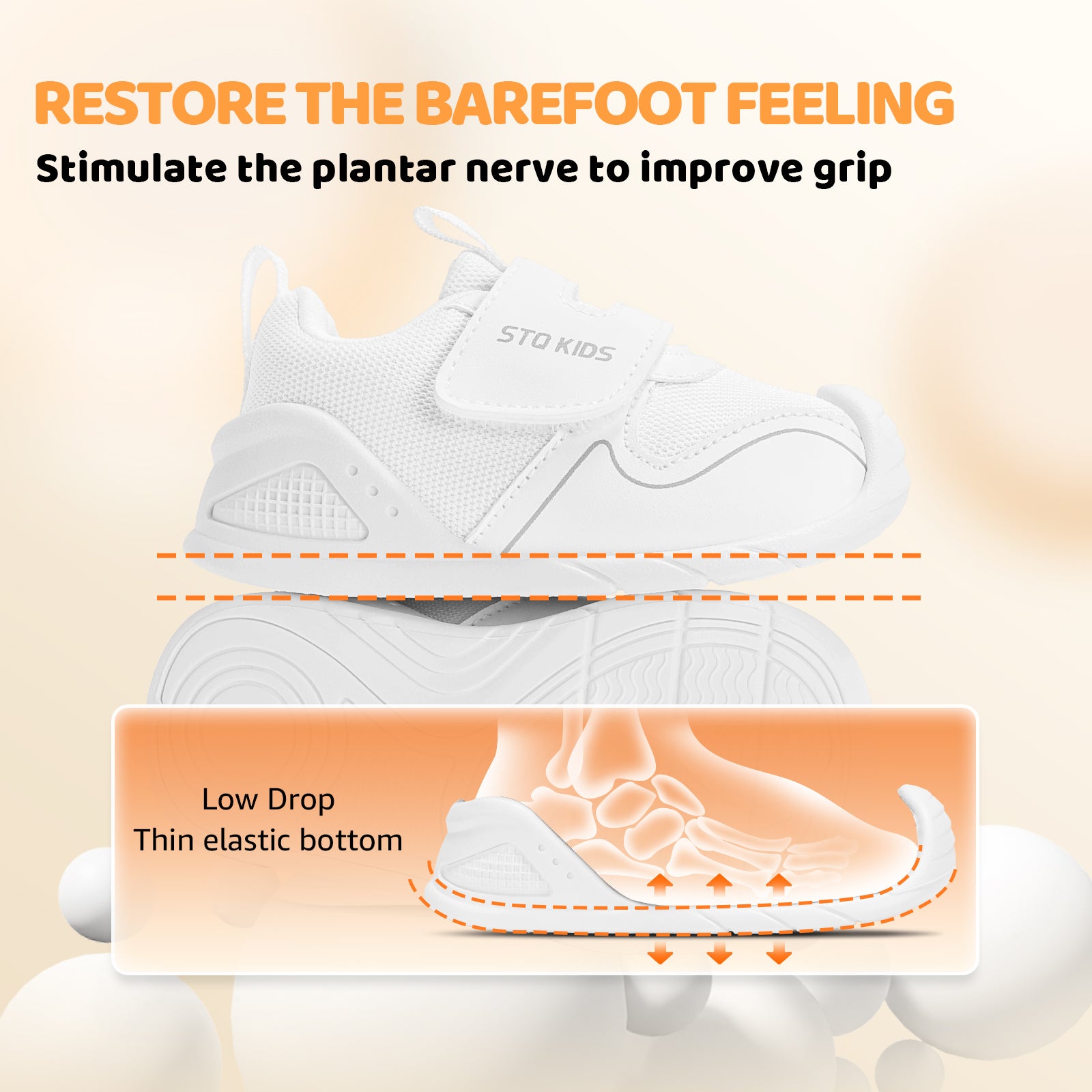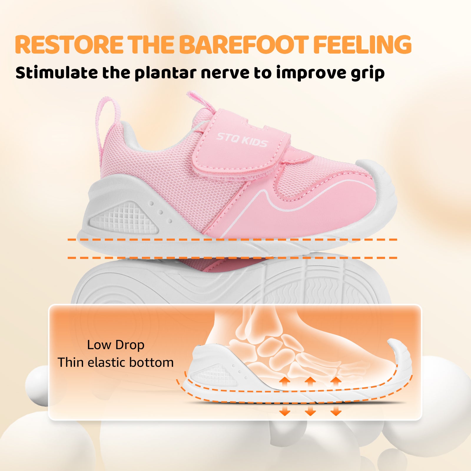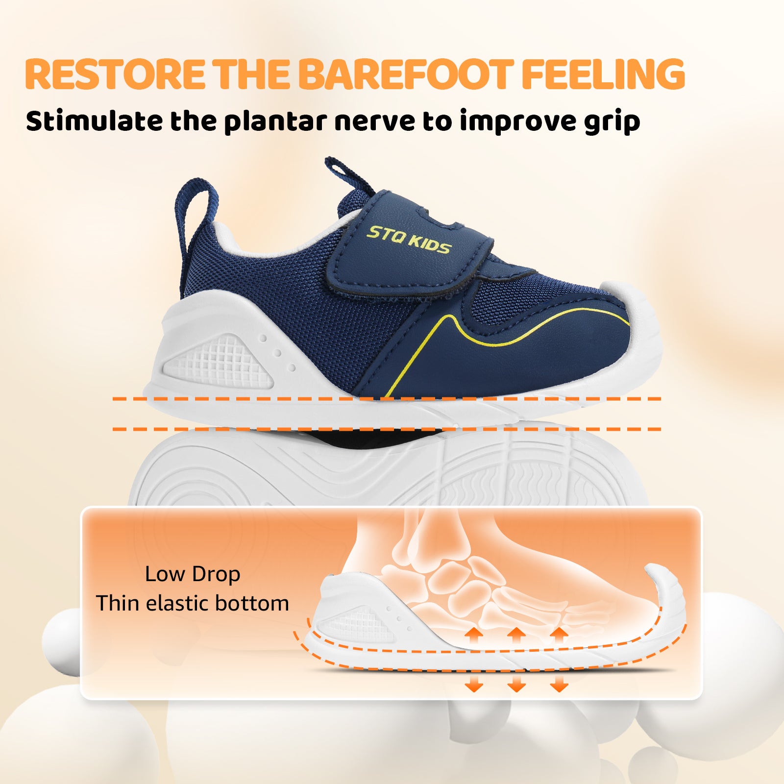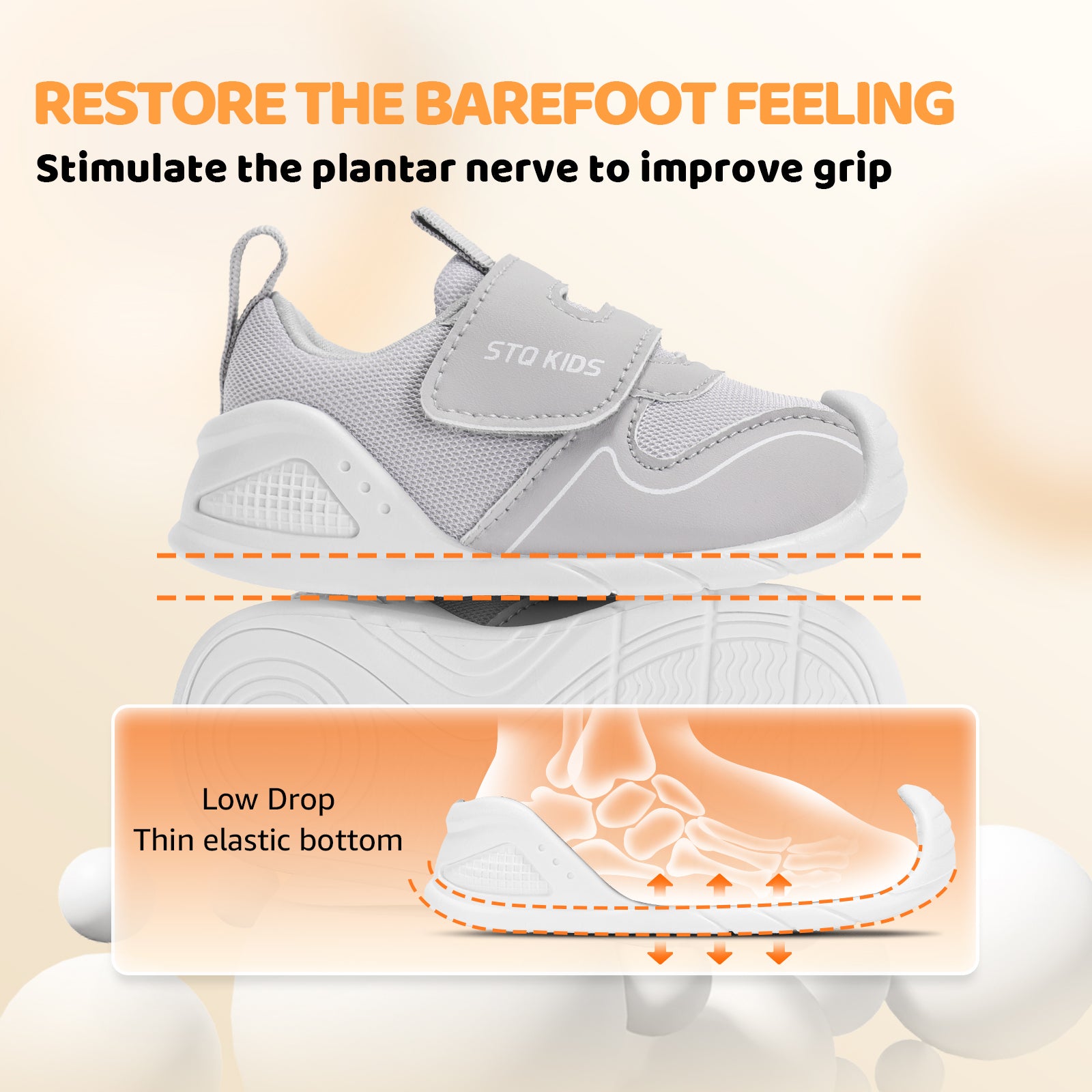 - Non-slip sole: Made of TPR non-slip material with special non-slip pattern, it effectively increases ground friction. The TPR sole is highly durable, wear-resistant, lightweight, and built to withstand daily active play. The 15° upturned toe supports natural movement, protects ankles, strengthens foot muscles, promotes healthy bone development, stabilizes walking, and reduces risk of falls and injuries