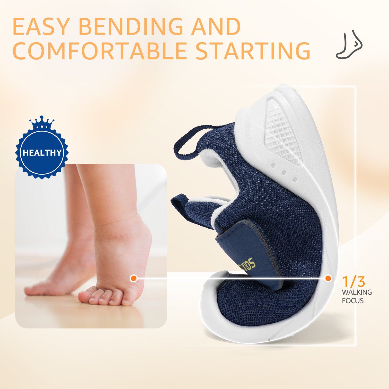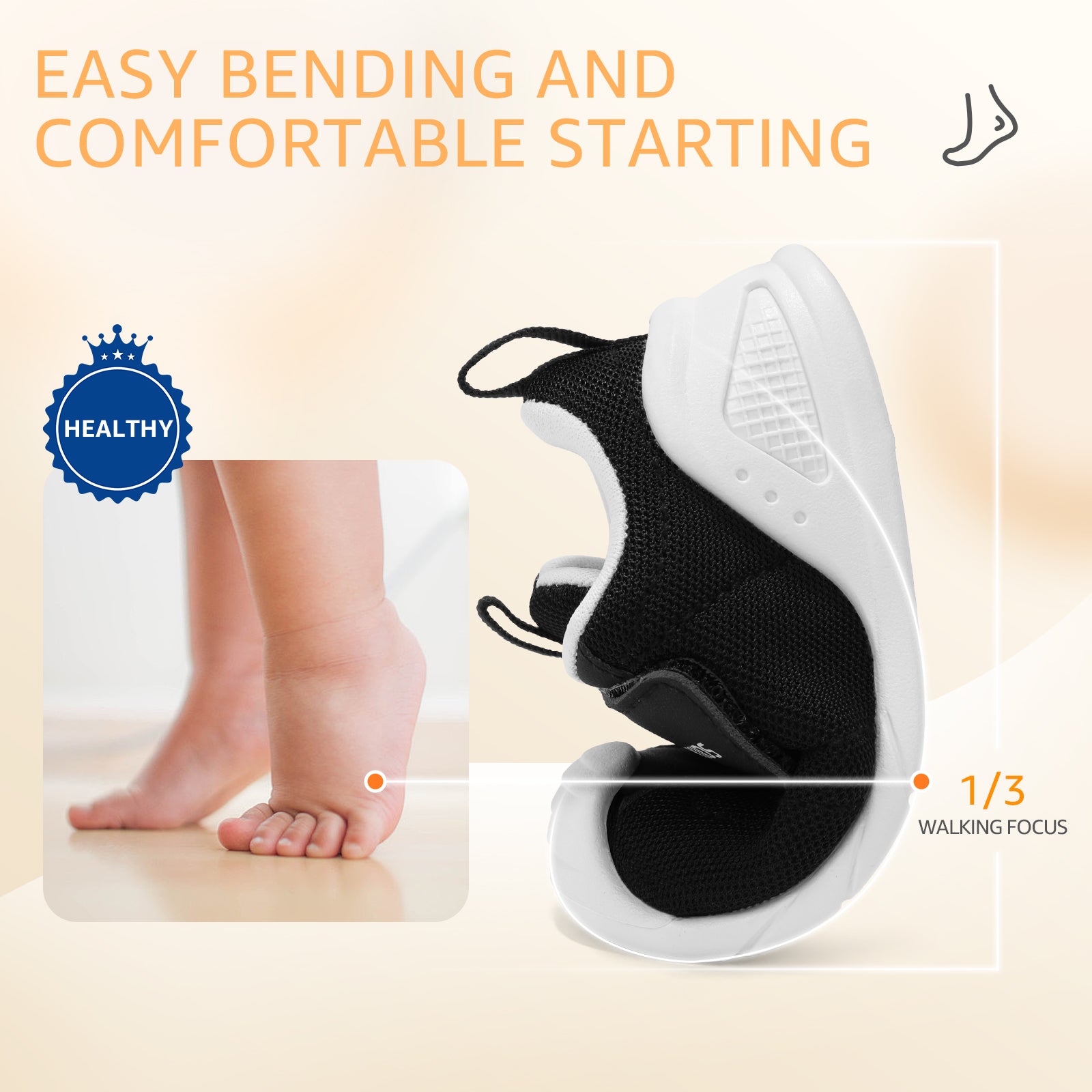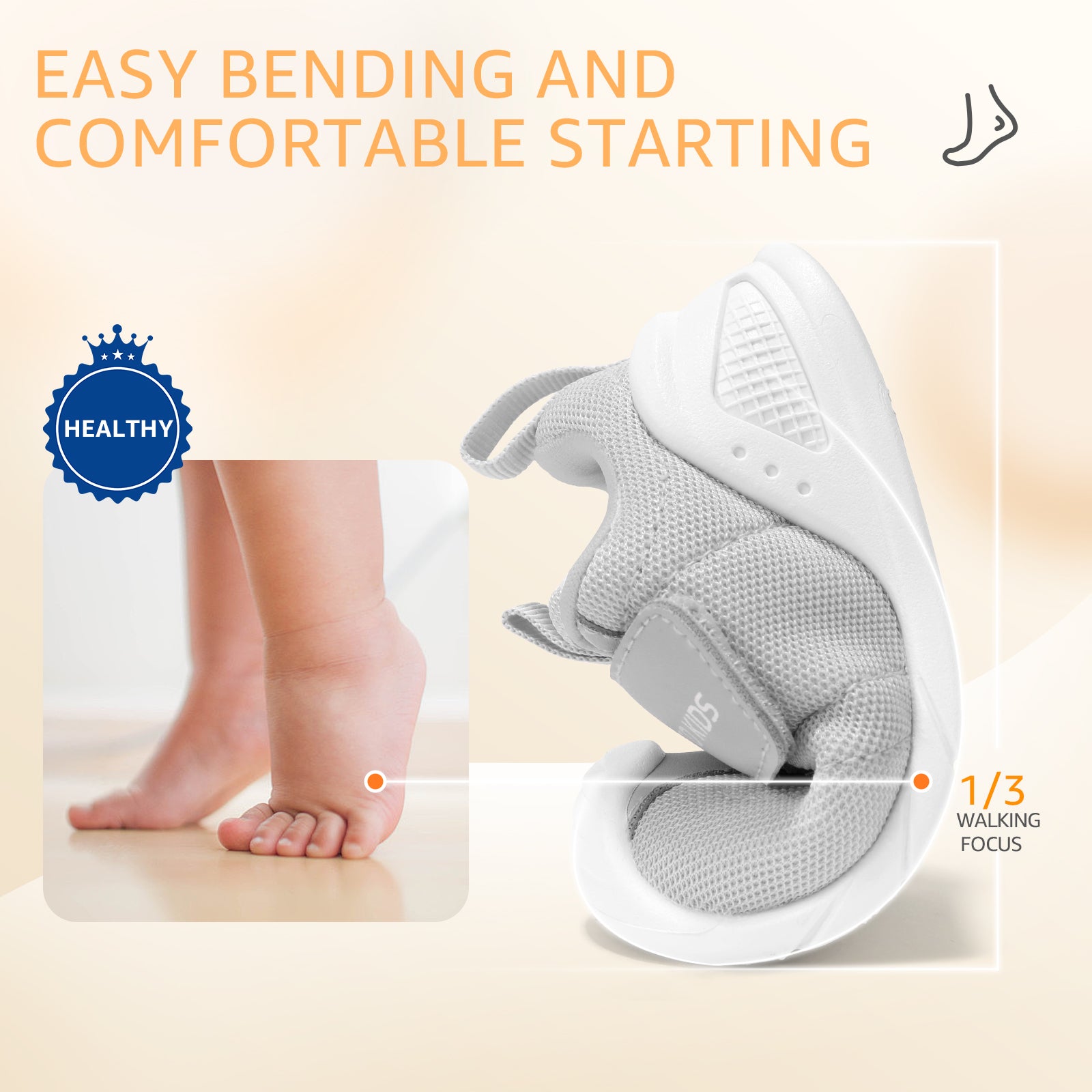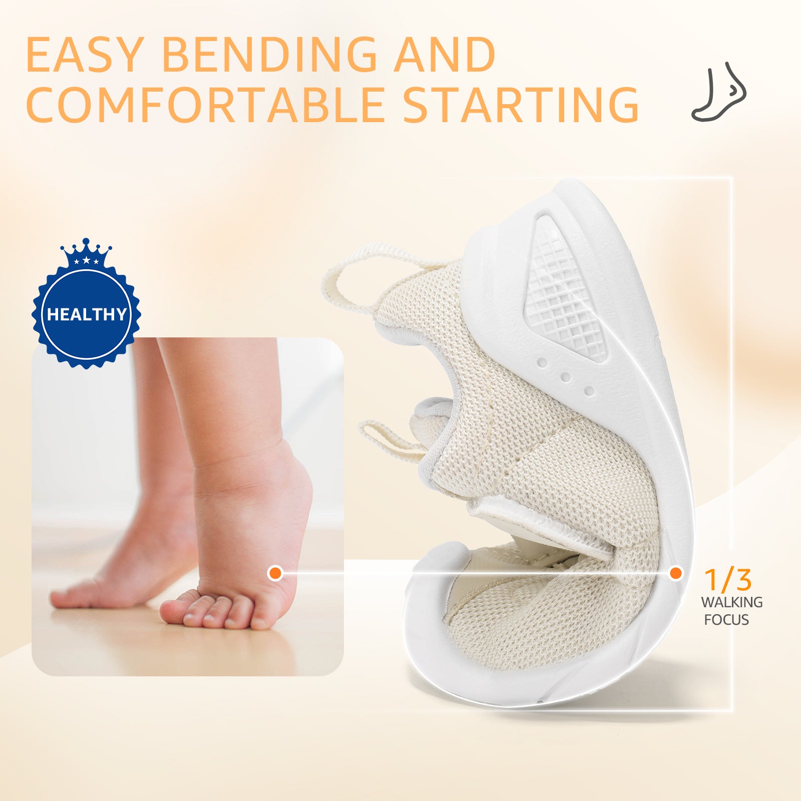 - [ Stabilizing Heel Cup ]: This baby shoes designed for first walking. Flexible sole, natural bending at the 1/3 forefoot aligns with toddlers foot movement, encouraging proper gait. Stabilizing heel cupprevents ankle rolling and supports wobbly walkers