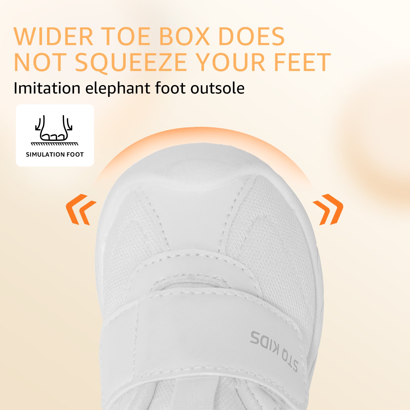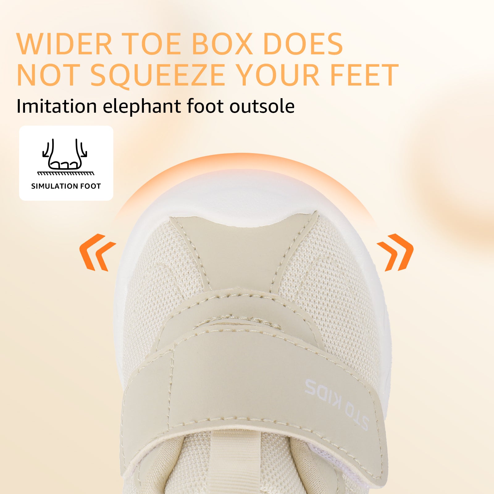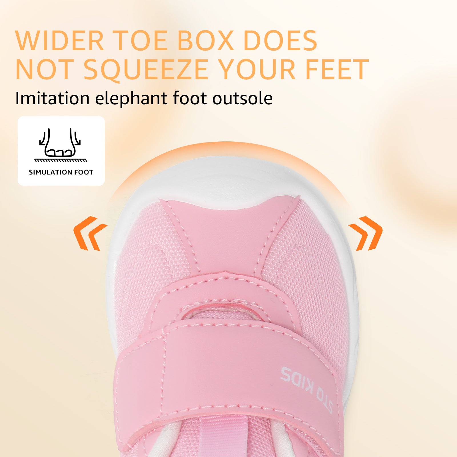 - [ Wide Toe Box ]: Designed for chubby baby feet, prevents toe squeezing and supports natural growth. Reinforced toe cap protects little toes during tumbles, against bumps during crawling and toddling. Zero drop sole, barefoot walking, feel natural steps